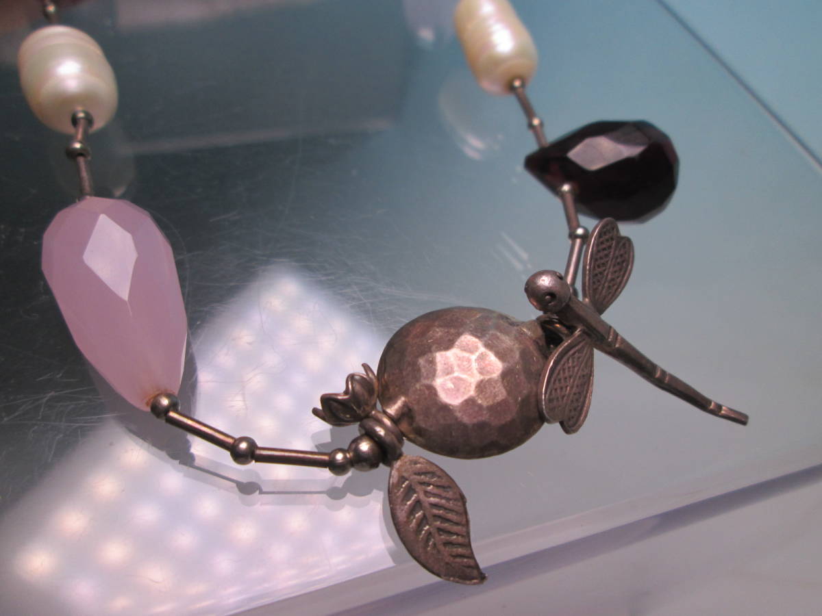 - ☆アメジスト/オニキス/ローズクオーツ/彫金細工 花と蜻蛉のデザインネックレス 51,65g とんぼ