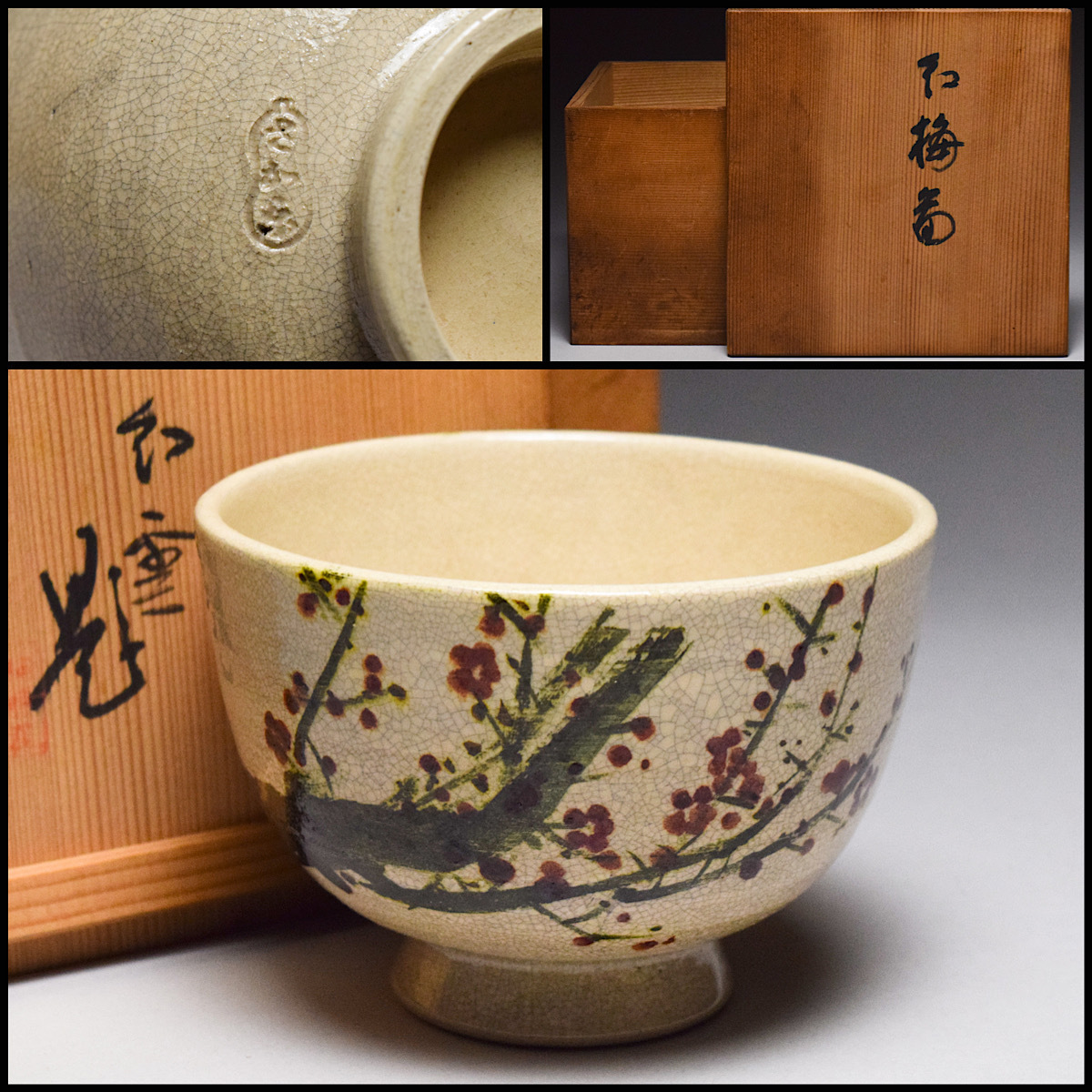 - 【八八八】さが楽 瓢箪印 紅梅図 茶碗 ◆共箱 茶道具 抹茶碗 【y-248】
