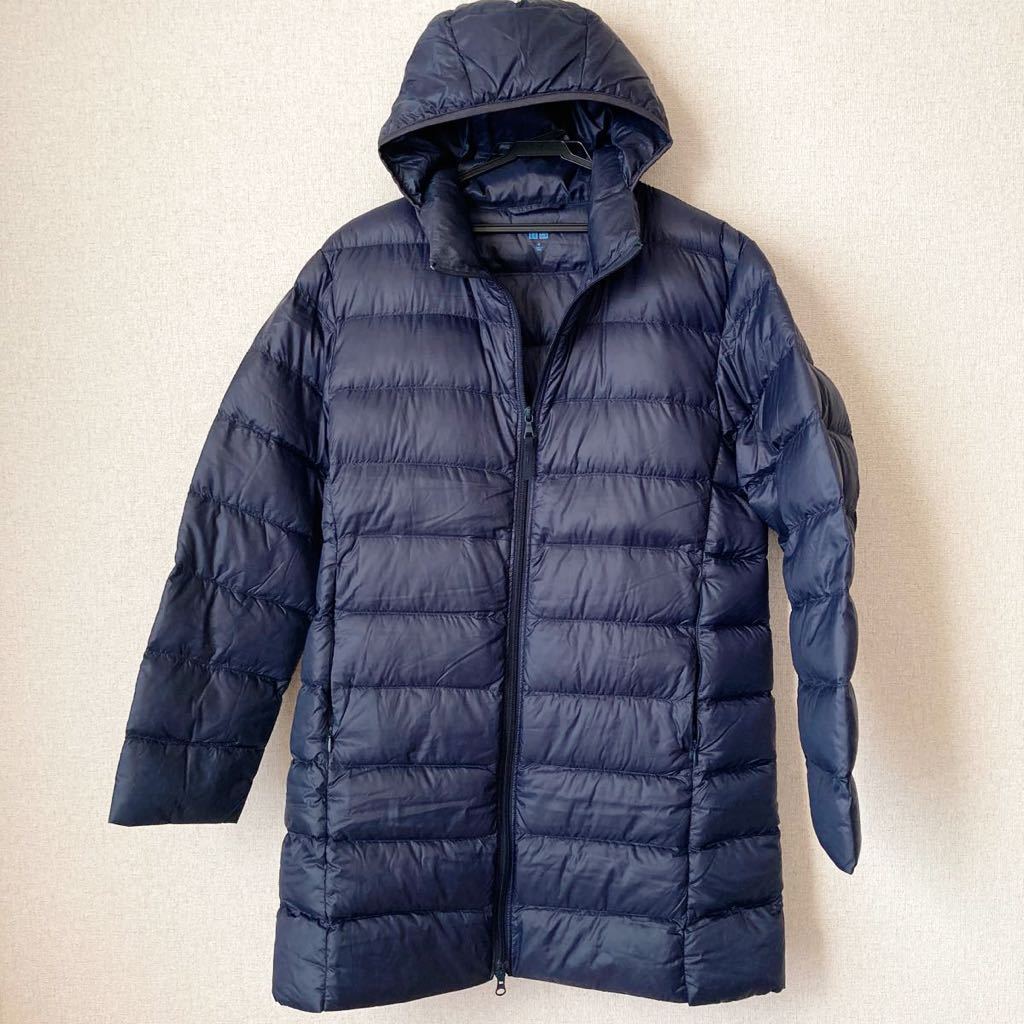 > 394)UNIQLO ユニクロ ウルトラライトダウン フード付き ハーフ コート ネイビー 紺色 M フェザー ダウン 収納袋なし