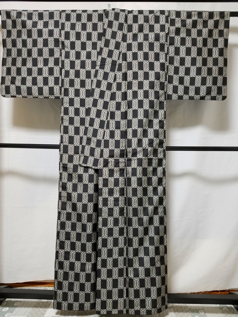 - 【桐徳】大島紬☆純泥*幾何学文☆送料無料*期間限定20%OFF{正絹*本場奄美*純泥大島紬*袷仕立*着物}*丈161-裄64.5*黒地*幾何学文*№5793