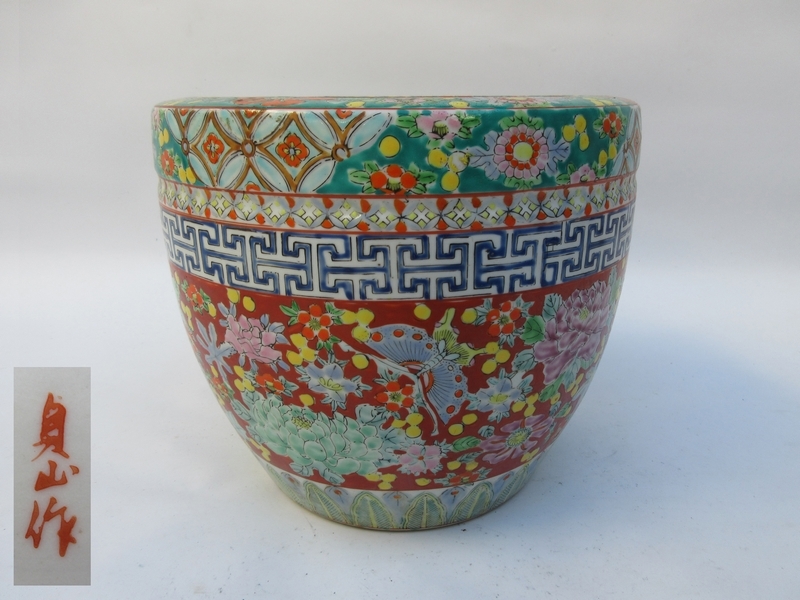 - 時代 火鉢■ 色絵十錦手 彩り豊か火鉢 [瀬戸火鉢 花蝶文] 貝山作 h約21cm■ 手あぶり インテリア アンティーク 火鉢 8575-2■