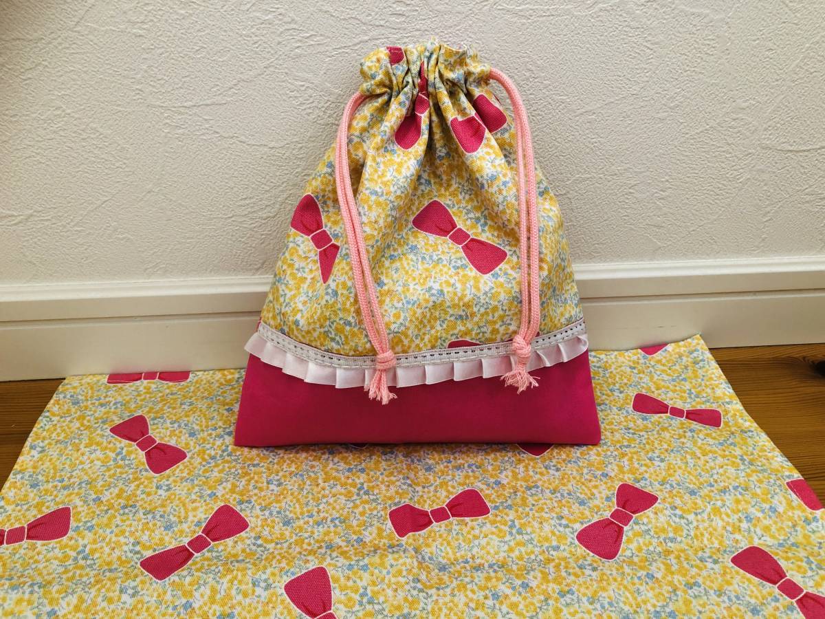 - リボン柄(花柄) イエロー① 給食袋&ランチョンマット ハンドメイド