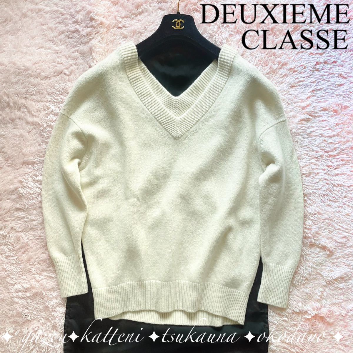 > DEUXIEME CLASSE ドゥーズィエムクラス カシミヤ混 ウール ミドルゲージニット Vネック リブ袖 白 ホワイト フリーサイズ