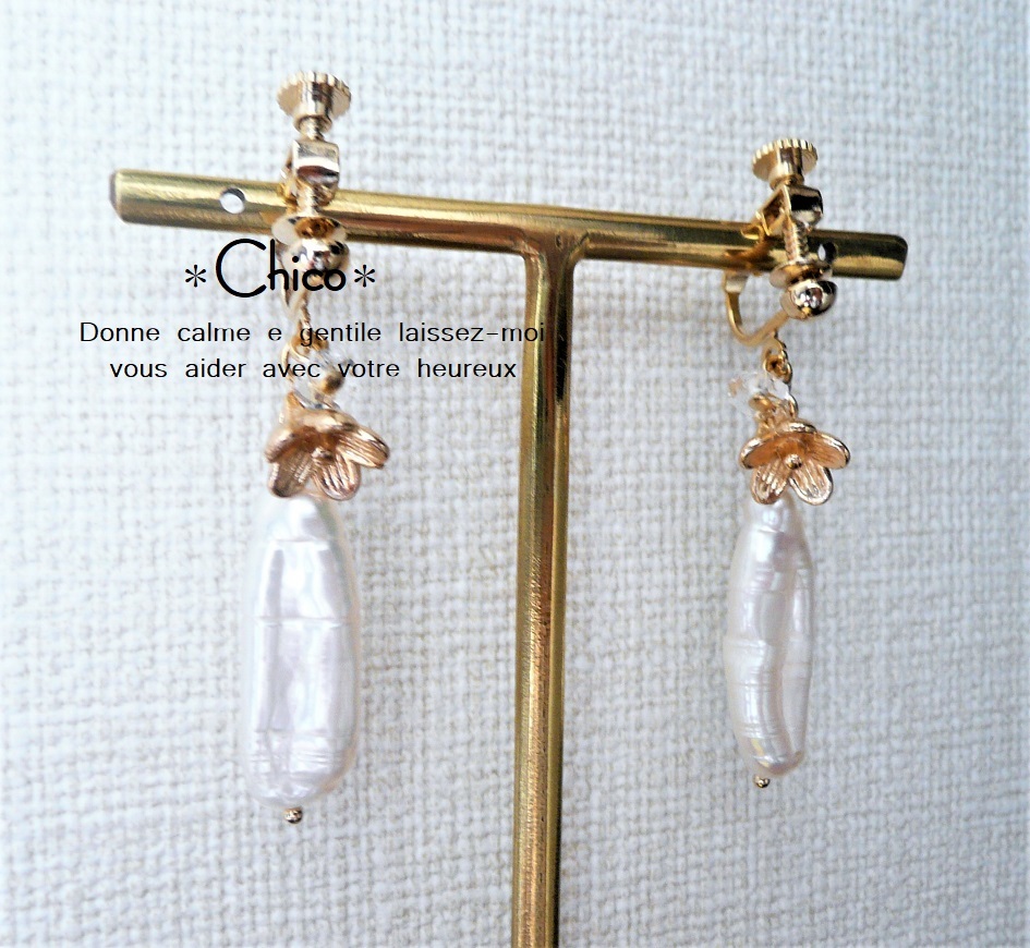 - ◆ホワイト ビワ淡水パール& 花・フラワーメタル&クリスタル ハンドメイドイヤリング♪ ★2点以上送料無料!