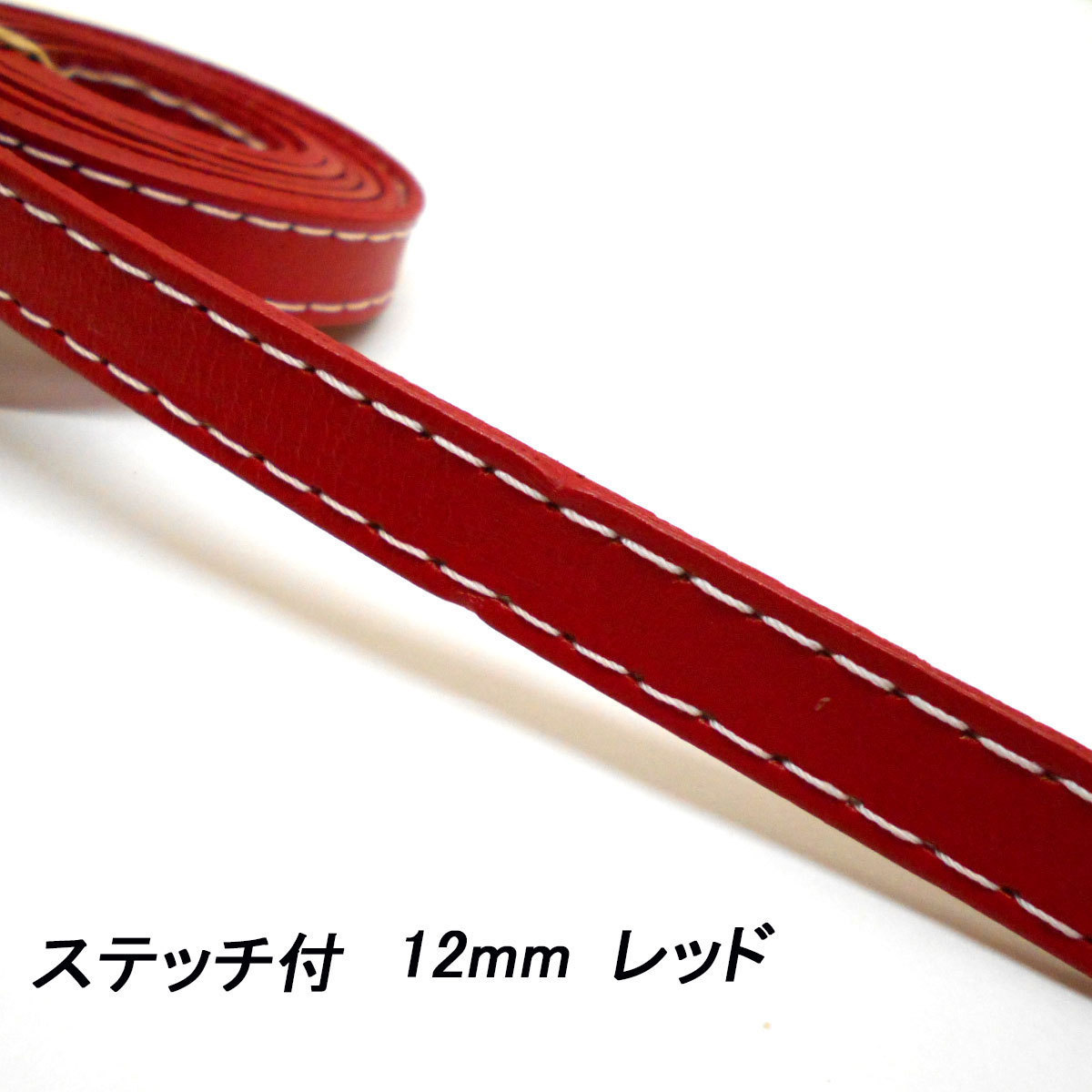 > レザークラフト 革テープ /ステッチ付/ 12mm /レッド/1m単位 革レース レザーコード 皮 バッグ ベルト バッグ持ち手 首輪