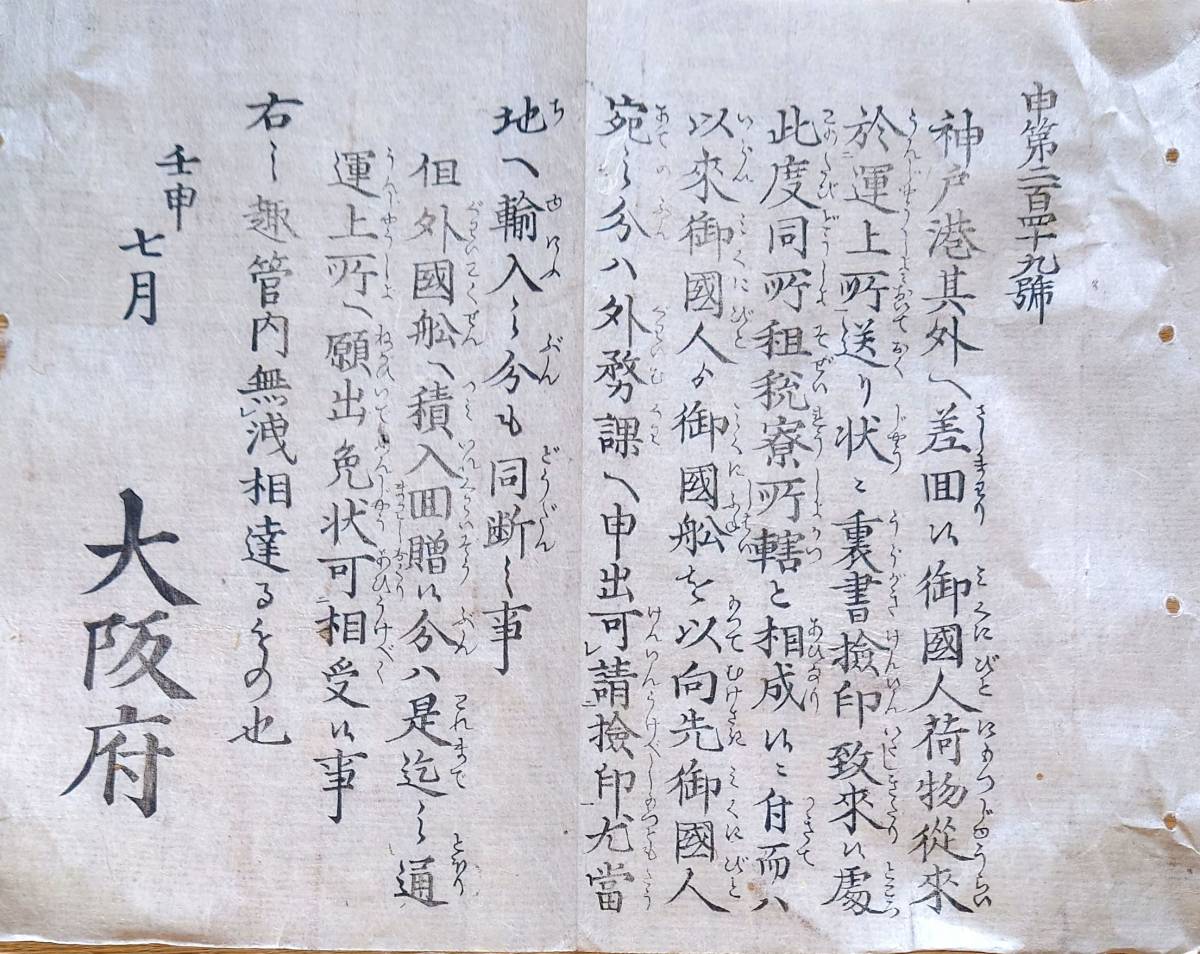 - f23022623〇明治布告布達 明治5年 神戸港其他へ差回し候御国人荷物 此度租税寮所轄 大阪府〇和本古書古文書