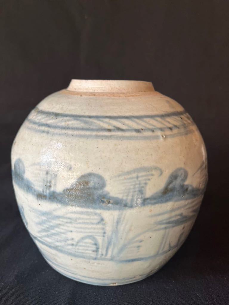 - 民藝の極致、見事な筆の流れ中国明代 民窯の豪快、力強さを感じる壺 川の流れ、浮かぶ舟、釣り人、背景の山水が何とも良い