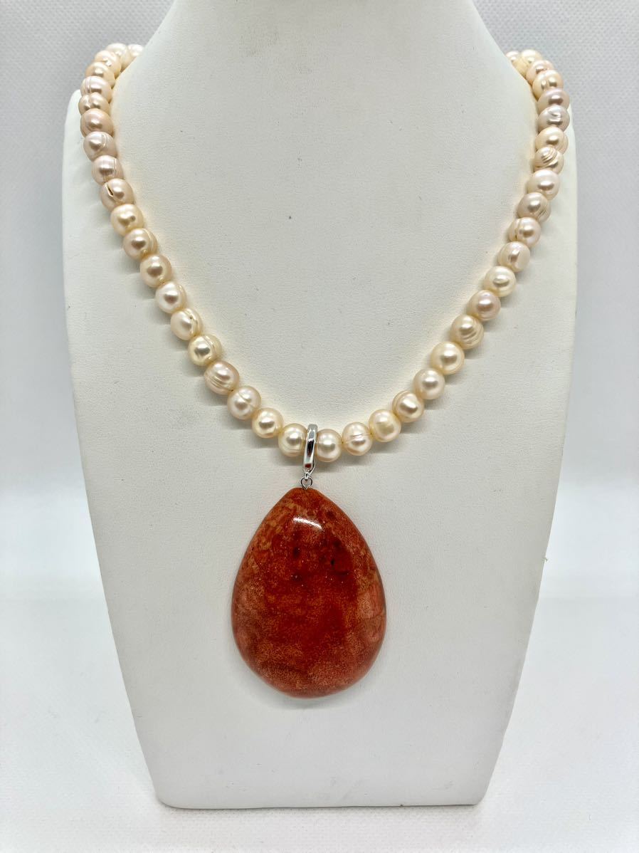 - 【新品】アフリカ珊瑚×パールネックレス*バロック真珠/クリッカー式バチカン取外し可能/サンゴさんごコーラル/しずく型/3月誕生石/天然石