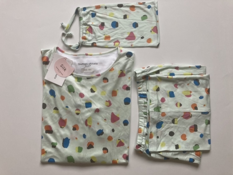 - ツモリチサト パジャマ Lサイズ シルク100% ギリシャ ペプルドット ネコ顔 猫 巾着 旅行 メロン クルーズ カラフル ワコール ルームウェア