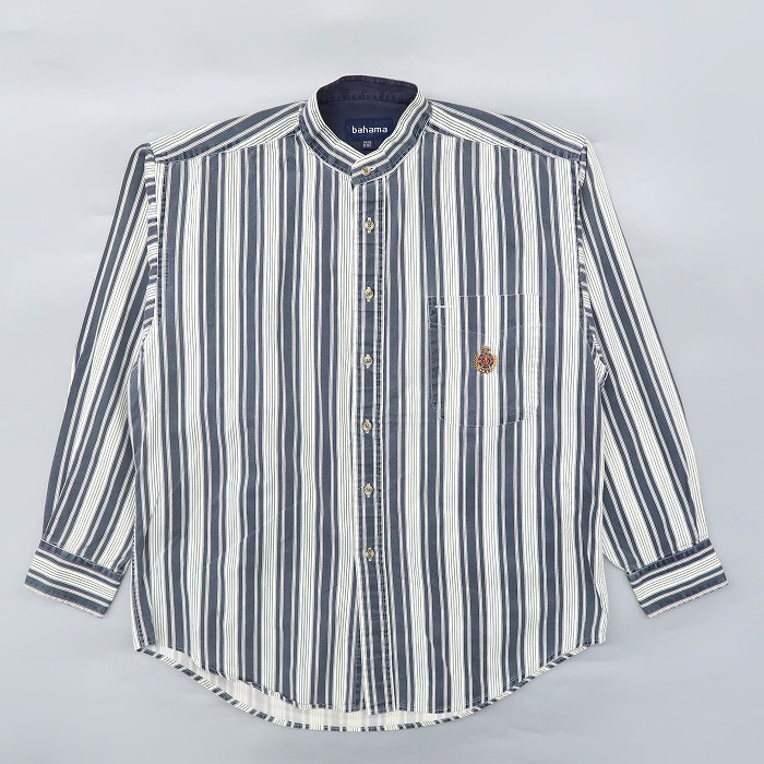 - 古着 バンドカラーシャツ ストライプ 長袖 ネイビー ホワイト グリーン サイズ表記:M gd76465