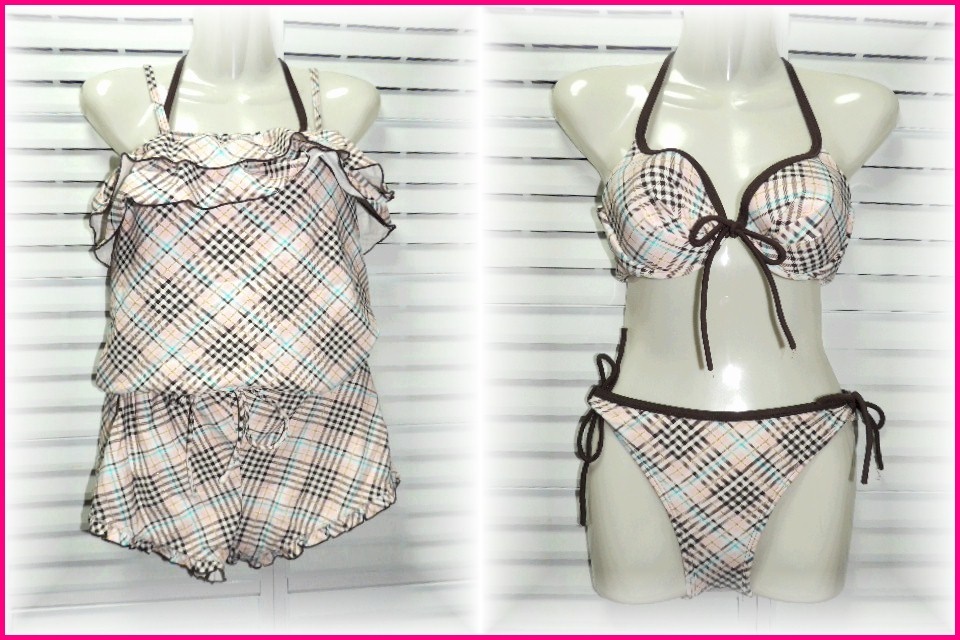 - セパレート水着 サロペットセット 9号/M ホワイト地×ブラウン・ピンク・ブルー・ゴールドチェック