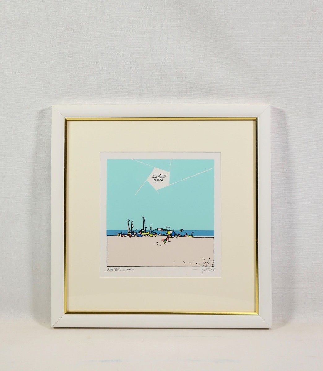 > 真作 馬場利貞 シルクスクリーン「Beach」画寸 16×16cm 福岡県出身 仁科展で活躍 ポップで簡素化された線と色彩で楽しいビーチを表現 7392