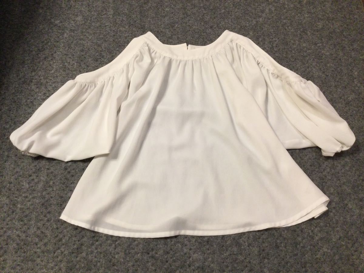 - オープンショルダーブラウストップス パステルカラー ホワイト白 シフォンチュニック 五部袖七分袖 カットソープルオーバー フェミニン