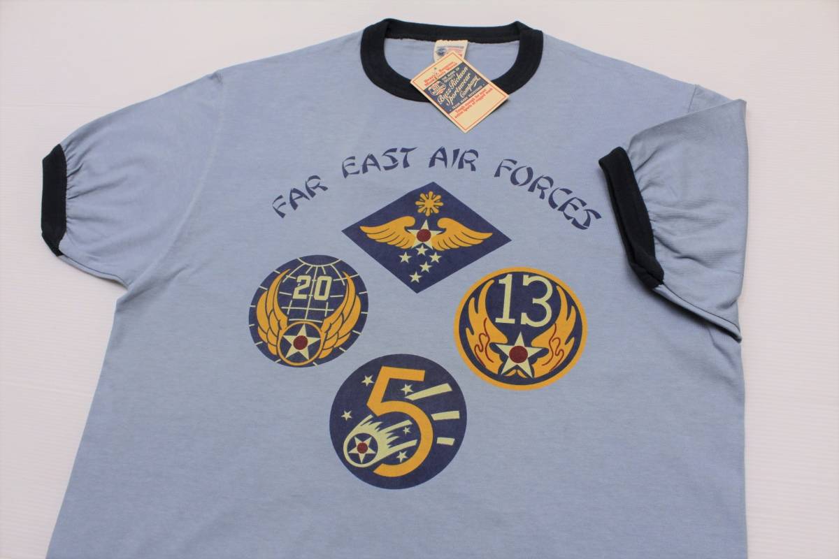 > YTS20東洋XSアジアUSエアフォース 日本 オキナワFAR EASTステンシルUSA製 リンガーTシャツBuzz Rickson'sバズリクソンズ 色少し杢ブルー