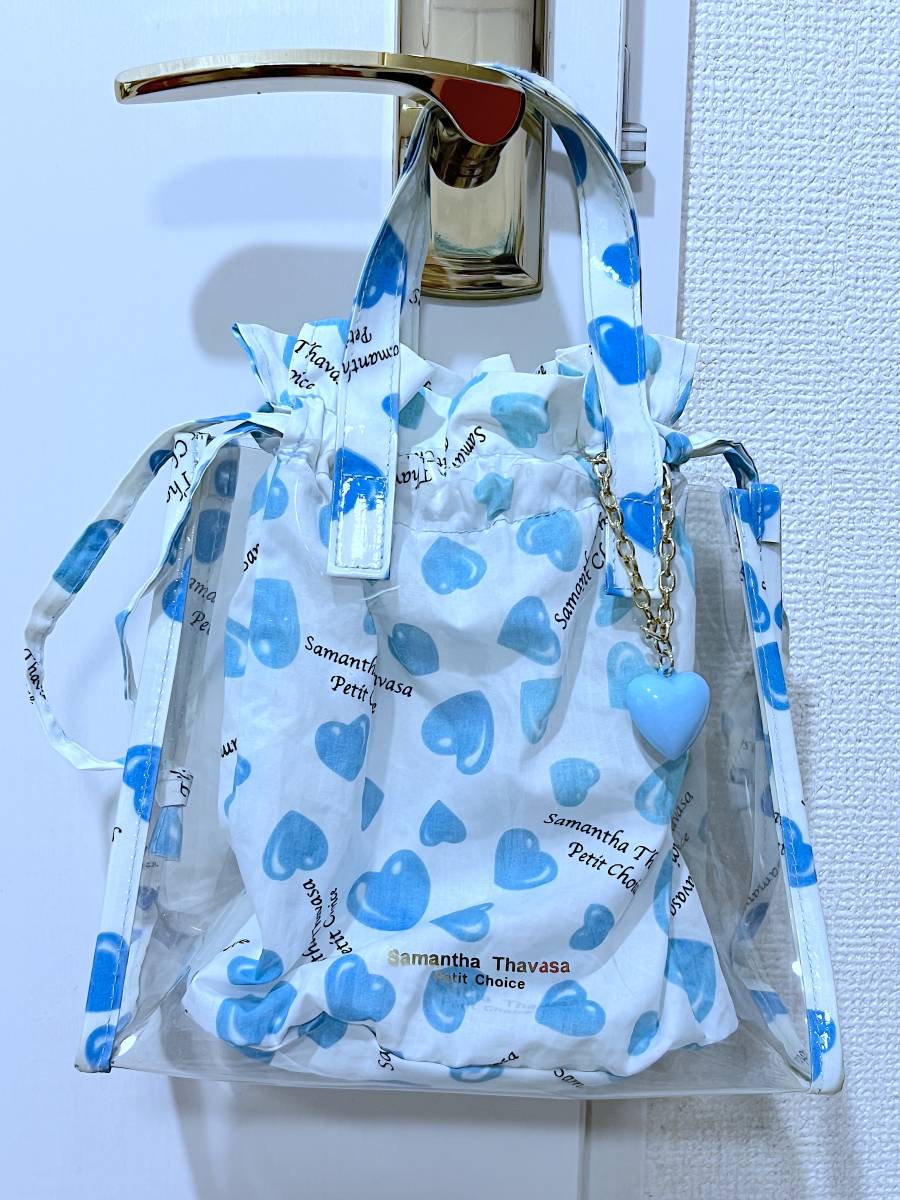- 中古 サマンサタバサ Samantha Thavasa 巾着付き 透明ビニール 水色 水玉 手提げバッグ バッグインバッグ ハートのチャーム