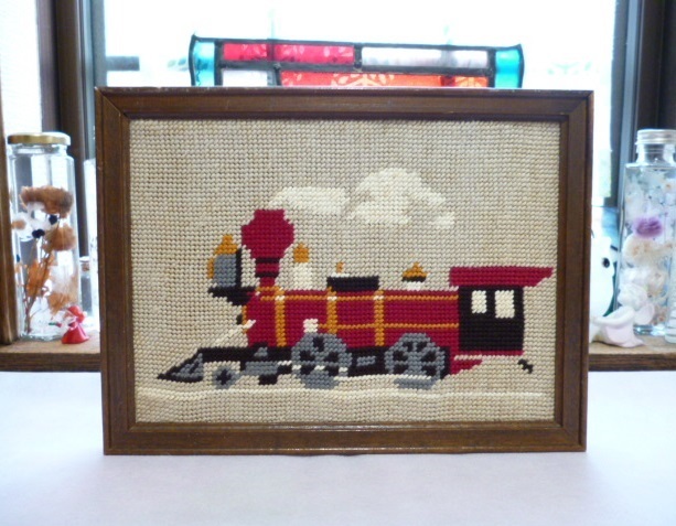 - ζБ フランス ヴィンテージ 刺繍 壁飾り 壁掛け 機関車 ζБ France レース 飾り 額
