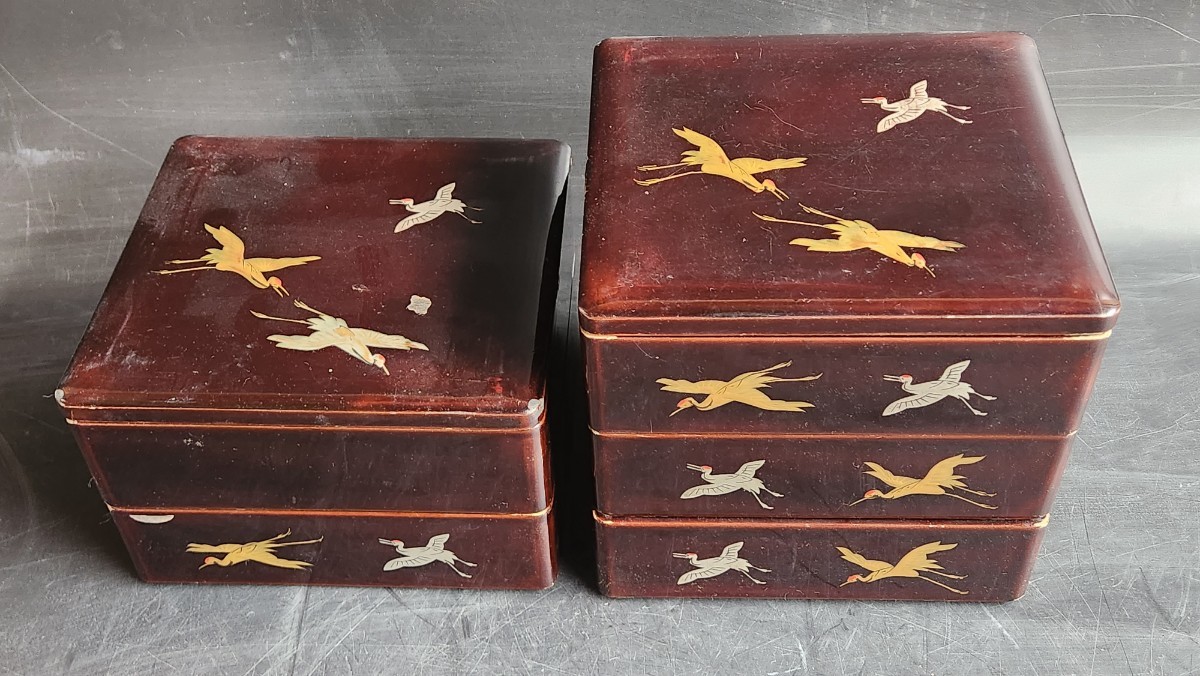 - 小重箱 5段 木箱付き 溜色 鶴の蒔絵 内朱塗