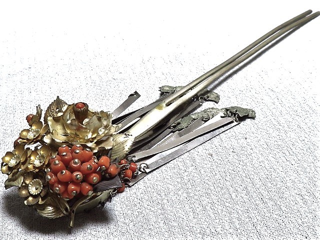 - ビラかんざし 金工細工 珊瑚 髪飾り 簪 彫金 和装小物