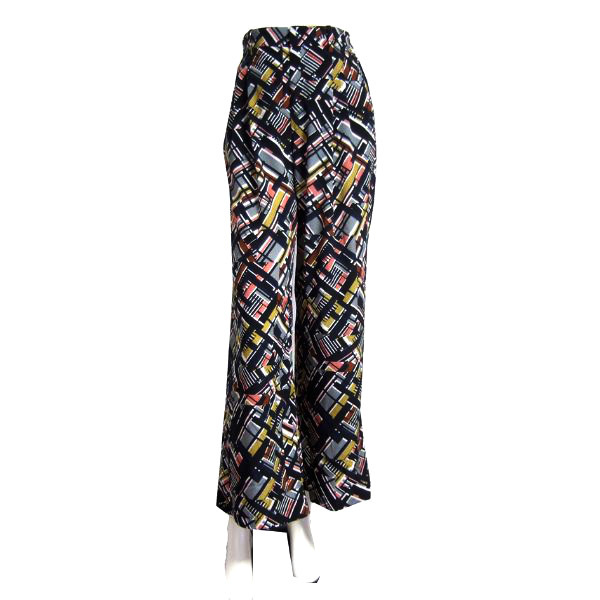 > 新品同様/IMPRESSION アツロウタヤマ ATSURO TAYAMA フレアパンツ 小さい 表記 USA4 S 相当 黒系 レディース 春夏 ボトムス 薄手 幾何学柄