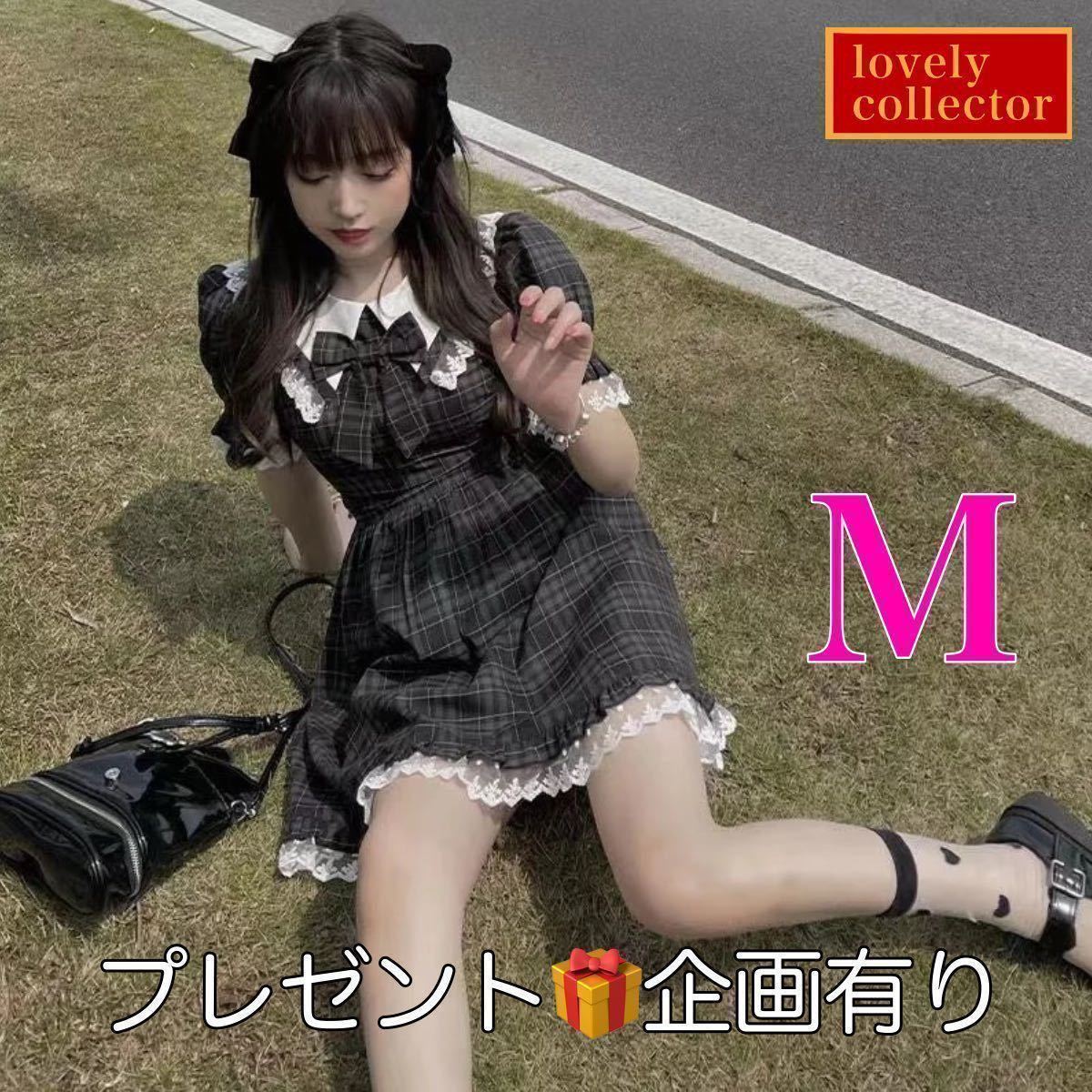 - 韓国ファッション ブラック チェック柄 ワンピース 夏 レースパン襟 M