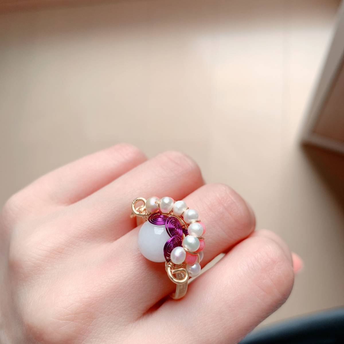 - ◇刀馬旦◇金糸白玉+淡水真珠+ ピンクオパール ◇フリーサイズ◇リング◇指輪◇パワーストーン◇ヒスイ◇巾着袋付◇プレゼントにも010R6408