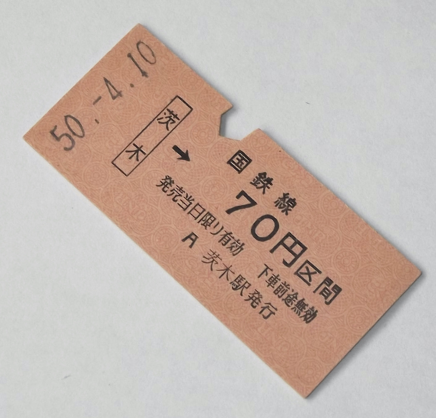 - 昭和50年 国鉄線 硬券 切符 茨木駅 70円区間 B型 B券 大阪府