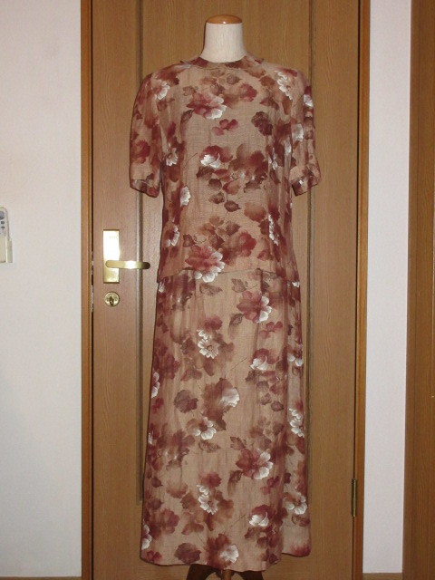 > I)■【IN AND OUT】■涼しいシャリ感/麻50%■美しいプリンセスライン着痩せダーツデザイン!■薄茶系/涼しい花柄/夏ブラウススーツ■