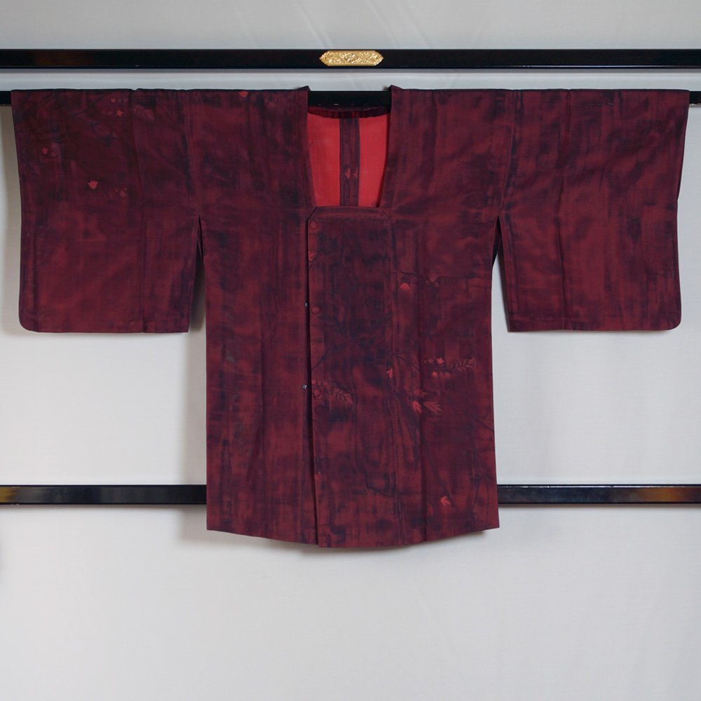 - 夏物 道行 紗袷 枝葉模様 黒・真朱色系 正絹 無双 二重紗 紗 塵除けコート 夏着物 夏用 盛夏 単衣 着物 コート リサイクル着物 きもの天陽
