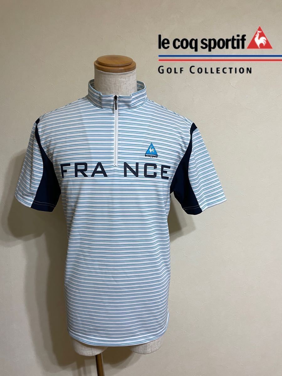 - 【美品】 le coq sportif golf ルコック ゴルフ ウェア ハーフジップ ドライ プルオーバ ボーダー柄 トップス サイズL 半袖 白 ネイビー 水