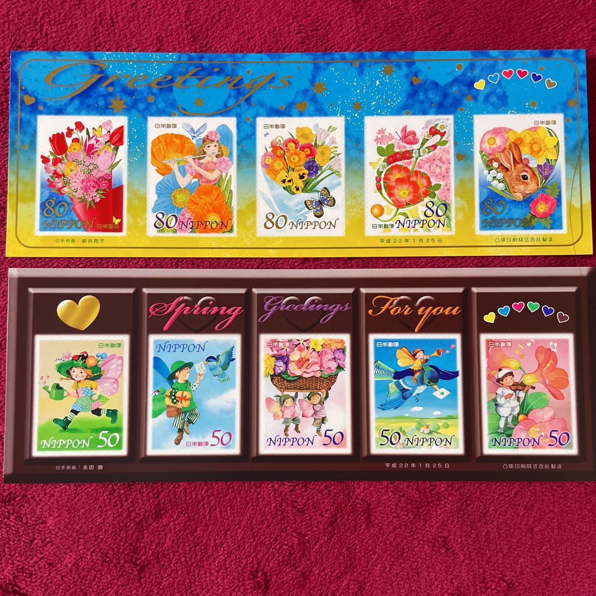 - 2010年 平成22年発行 特殊切手 春のグリーティング切手 記念切手 シール切手 80円切手×5枚 1シート50円×5枚 1シート セット
