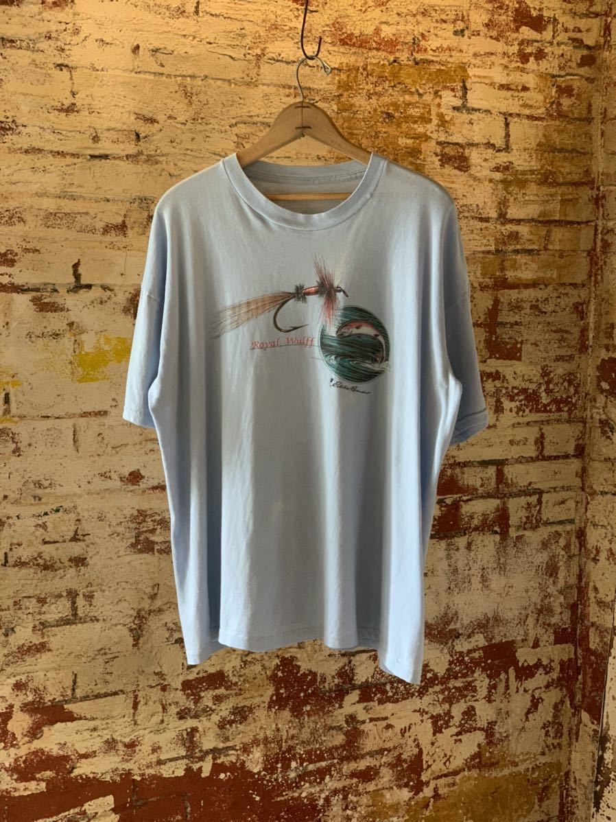 - 80s Eddie Bauer PRINTED Tee Royal Wulff ヴィンテージ ビンテージ エディーバウアー プリントTシャツ OUTDOOR XL 70s ルアー 送料無料