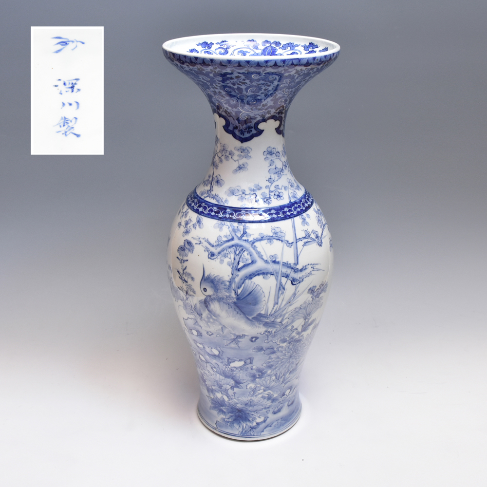 > 旧宮家伝来 大名品 明治期 オールド深川 深川製磁染付花鳥図大花瓶 高さ60cmオーバー オールド香蘭社 有田焼 里帰り品 里帰 輸出手 y1986