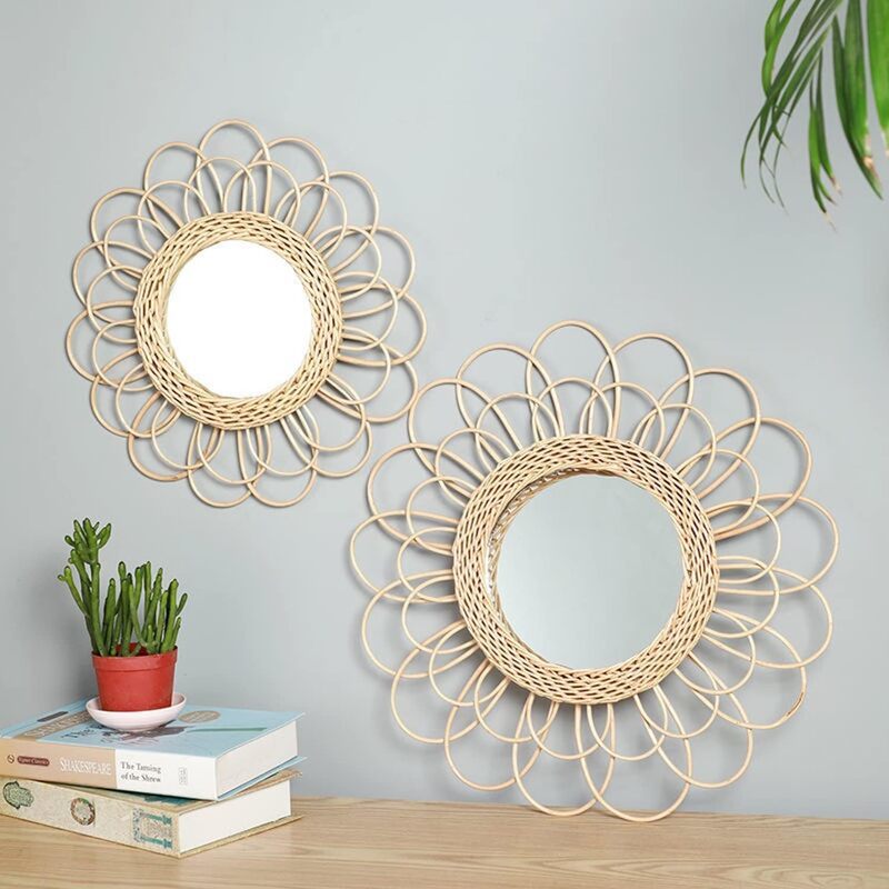 - ラタン装飾の円形ミラー 鏡 おしゃれ かわいい 壁掛け 籐製 ドレッシングミラー 化粧鏡 手作り インテリア 壁飾り ラウンドミラー