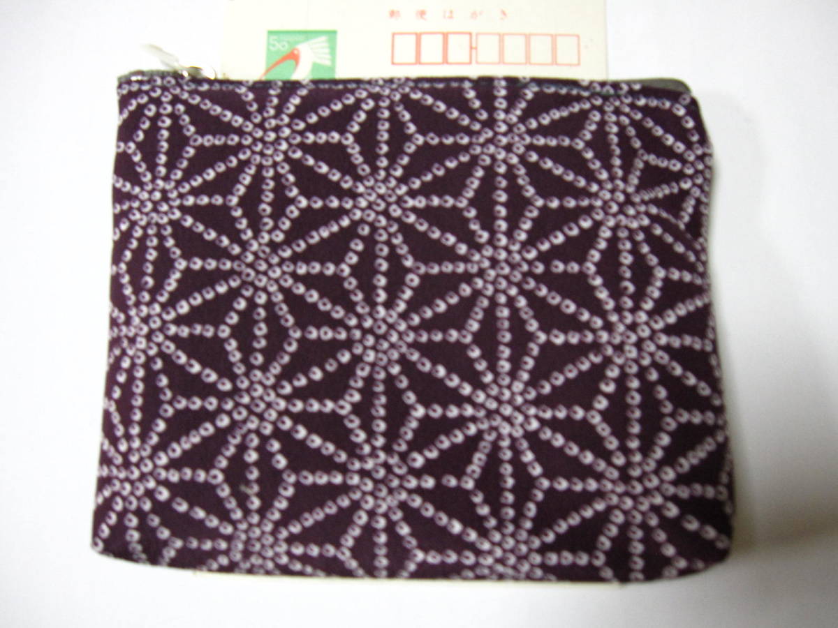- 手作り 着物リメイク ポーチ 濃い紫 麻の葉 鹿の子風 模様 小紋 古布 財布 小物 充電器 男女 兼用 レトロ ハンドメイド 格安 可愛 お洒落