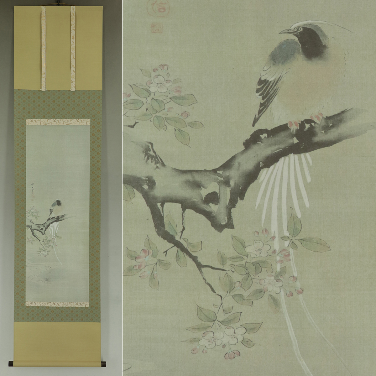 - 【巧芸】狩野探幽【海棠に尾長鳥】◆絹本◆共箱◆掛軸 u10168