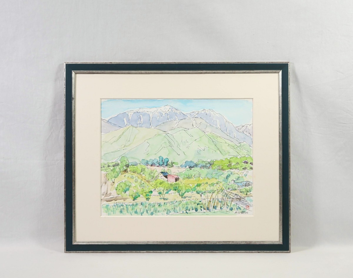 > 真作 末木健 1999年 水彩ペン「鳳凰三山」画寸 41cm×32cm 6号 新緑の稜線と爽快な青空の鳳凰三山を描いた春景図 7803