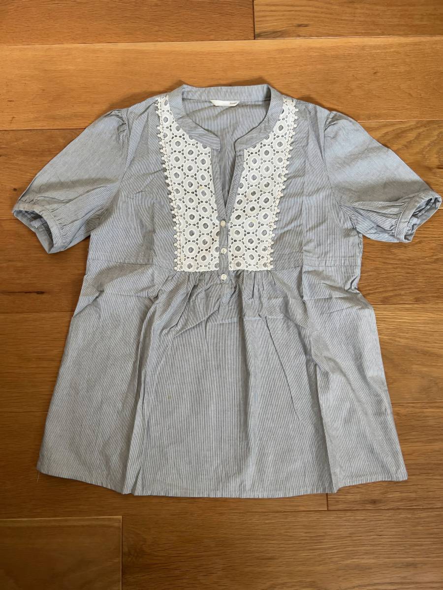 - favori ファヴォリ ★ 極細 ストライプ サークルレース 切り替え キーネック コットン 半袖 トップス ブラウス チュニック ふんわり 黒