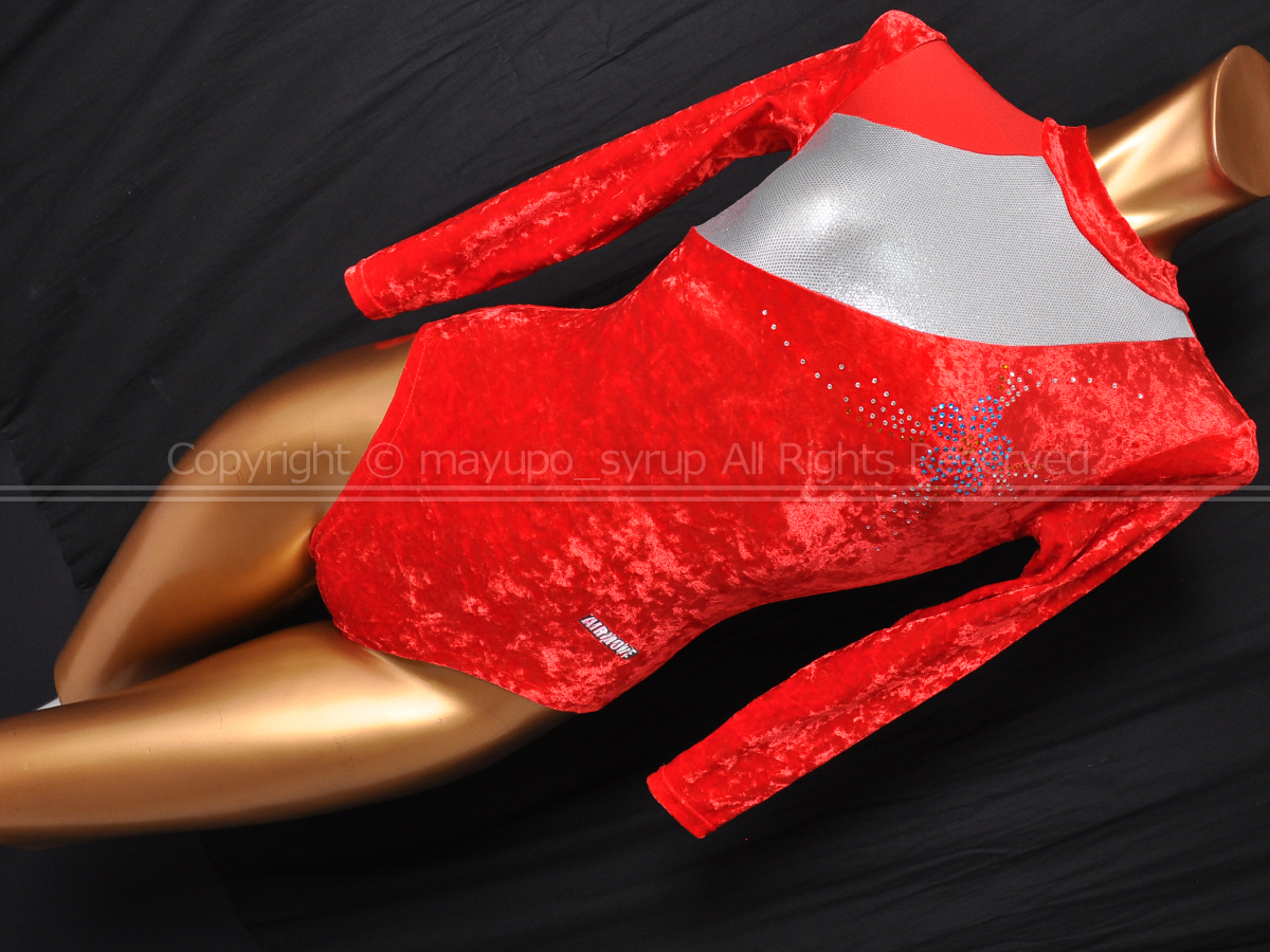 - L1215-42★AIRMOVE ベロア×光沢ホログラム ロングスリーブ体操レオタード レッド×シルバー SS