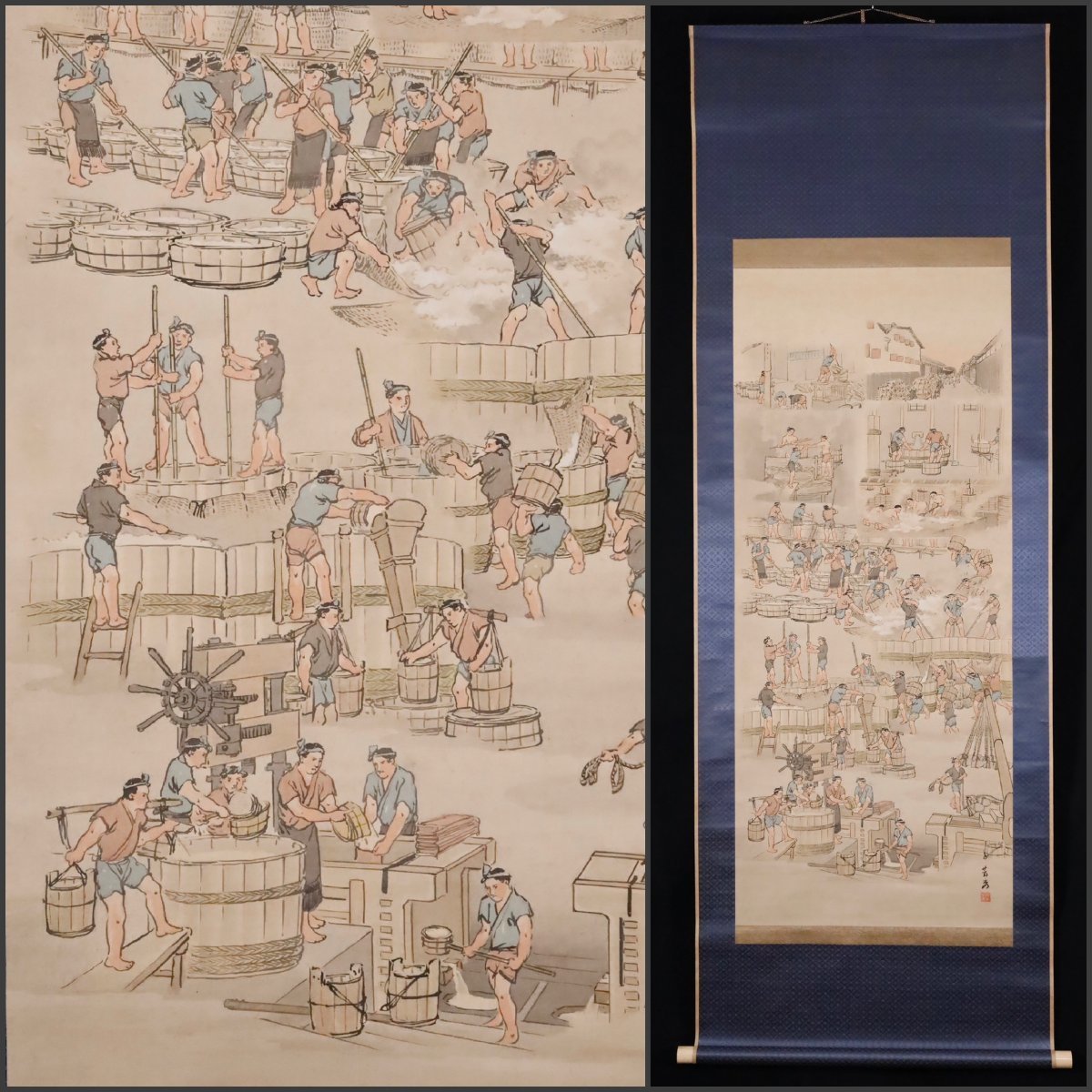 - 【模写】吉】9466 松本芳秀 紀州熊野 酒造図 風俗画 大和絵 職人 和歌山県 歴史画 物語絵 茶掛け 茶道具 掛軸 掛け軸 骨董品