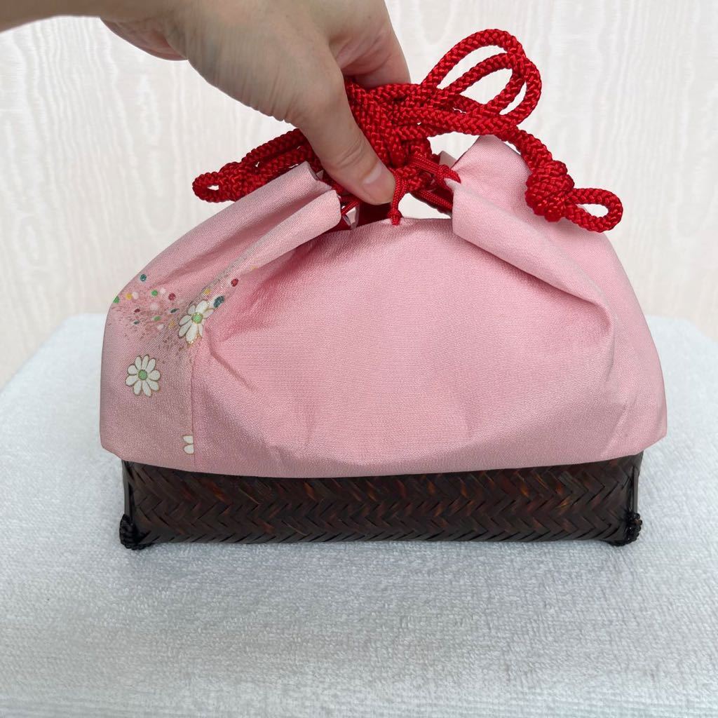 - 着物用 巾着 バック ピンク カゴ 着物生地
