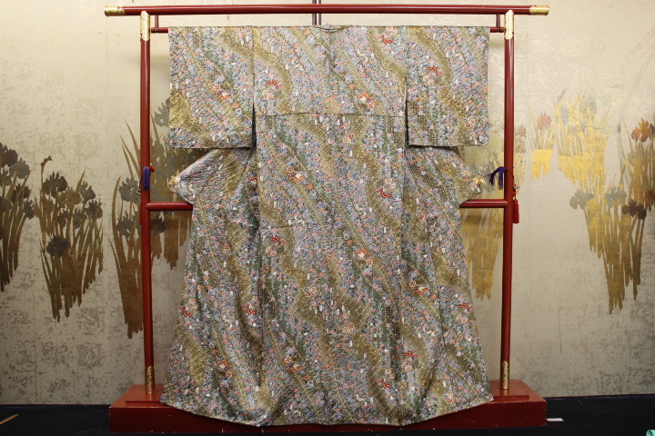 > きもの今昔5740 小紋のきもの 空絞りにグリーン基調の扇に蝶や草花の道長取りの柄 躾け糸付き未使用品 身丈158cm