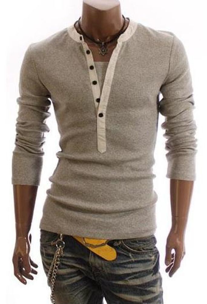 - メ8-8-1.ヘンリー ネック Tシャツ 無地 シンプル スリム グレー M