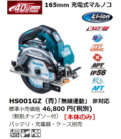 - マキタ 165mm 充電式マルノコ HS001GZ 青 本体のみ 鮫肌チップソー付 40V 新品