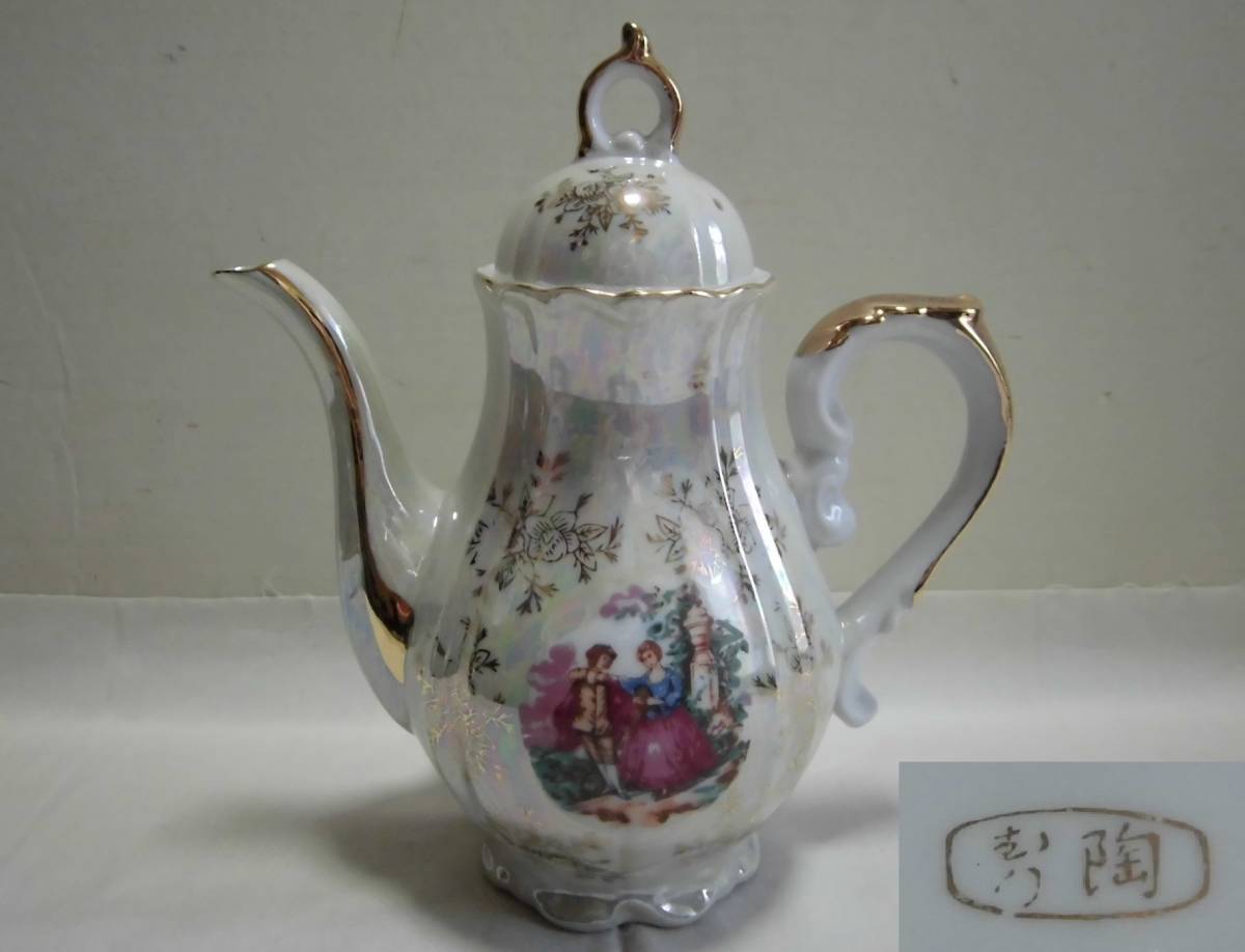- 水差し 寿陶 陶器 光沢 ラスター ティーポット コーヒーポット 取っ手付 蓋付 金彩 色絵 水注 工芸品 レトロ アンティーク
