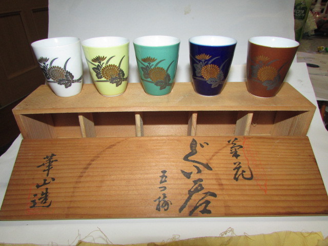 - 即決商品(会津若松・旧家・蔵出し)昭和レトロ・有田焼・華山造・栄花 (古い時代の味わいのる金彩菊模様ぐい呑・5客)貴重・珍品