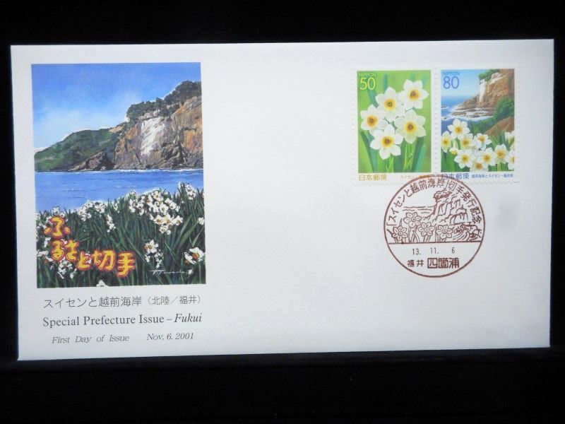 - ふるさと切手 スイセンと越前海岸 2種連刷 2001年11月6日 福井 四箇浦 初日カバー FDC 日本切手 L-138