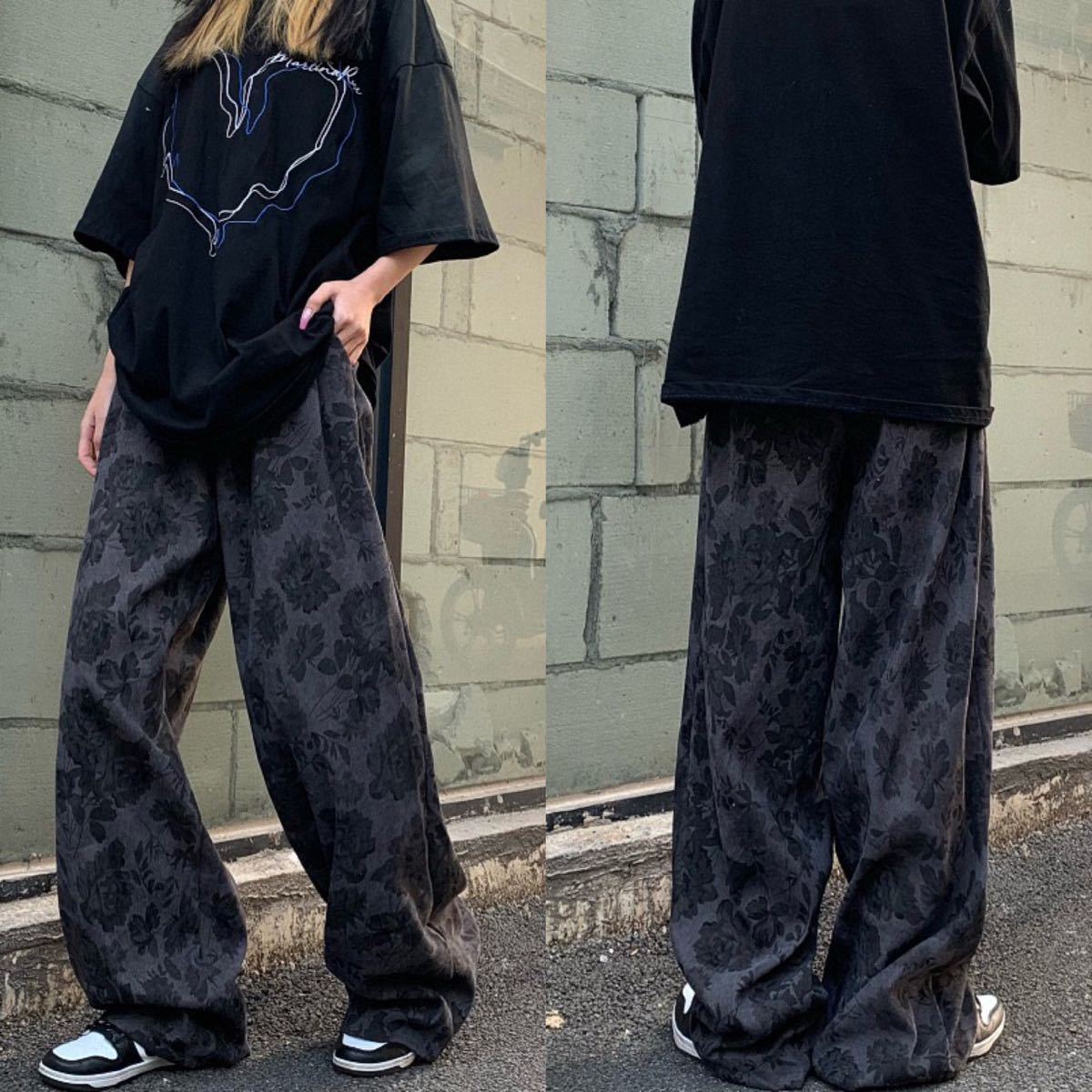 > ワイドパンツ 花柄 レトロ調 イージーパンツ ボトムス ルーズパンツ パンツ メンズ レディース ワイドレッグ ユニセックス 黒 ブラック L