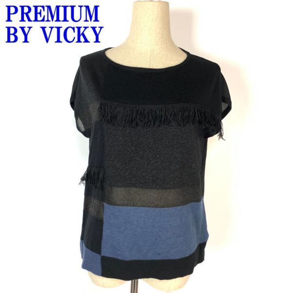 > プレミアムバイビッキーフリンジ切り替えデザイン半袖ニットブラック系PREMIUM BY VICKY カジュアル シアー透け感有 2 C7190