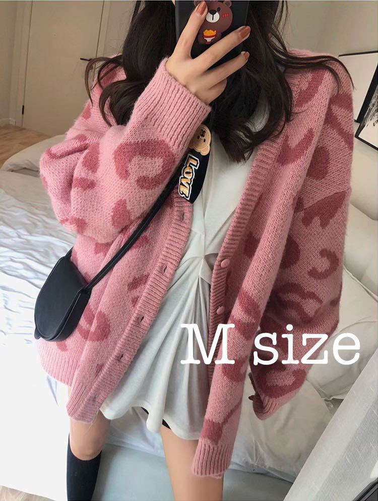 - カーディガン セーター 豹柄 ニット アウター 長袖 ビッグシルエット ピンク M