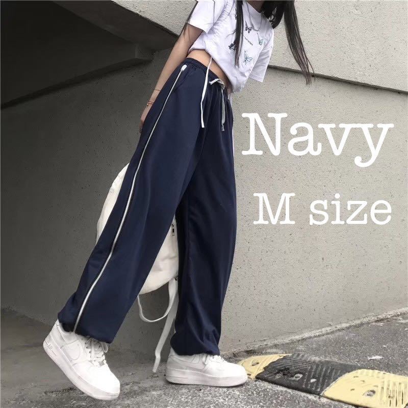 - ボトムス サイドジップ ワイドパンツ イージーパンツ ラインパンツ ユニセックス ダンス 衣装 紺色 ネイビー M